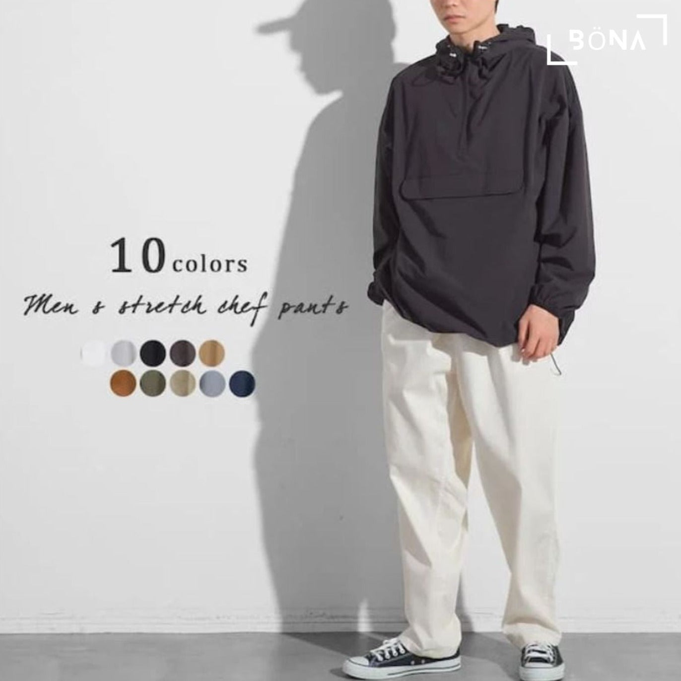 不太寬鬆的簡單廚師褲。 腰部有彈性,可以用繩子調節,是一款即使穿一整天也不會感到緊繃的無壓力衣服。 棉布的柔軟質地和聚氨酯的彈性使其易於移動