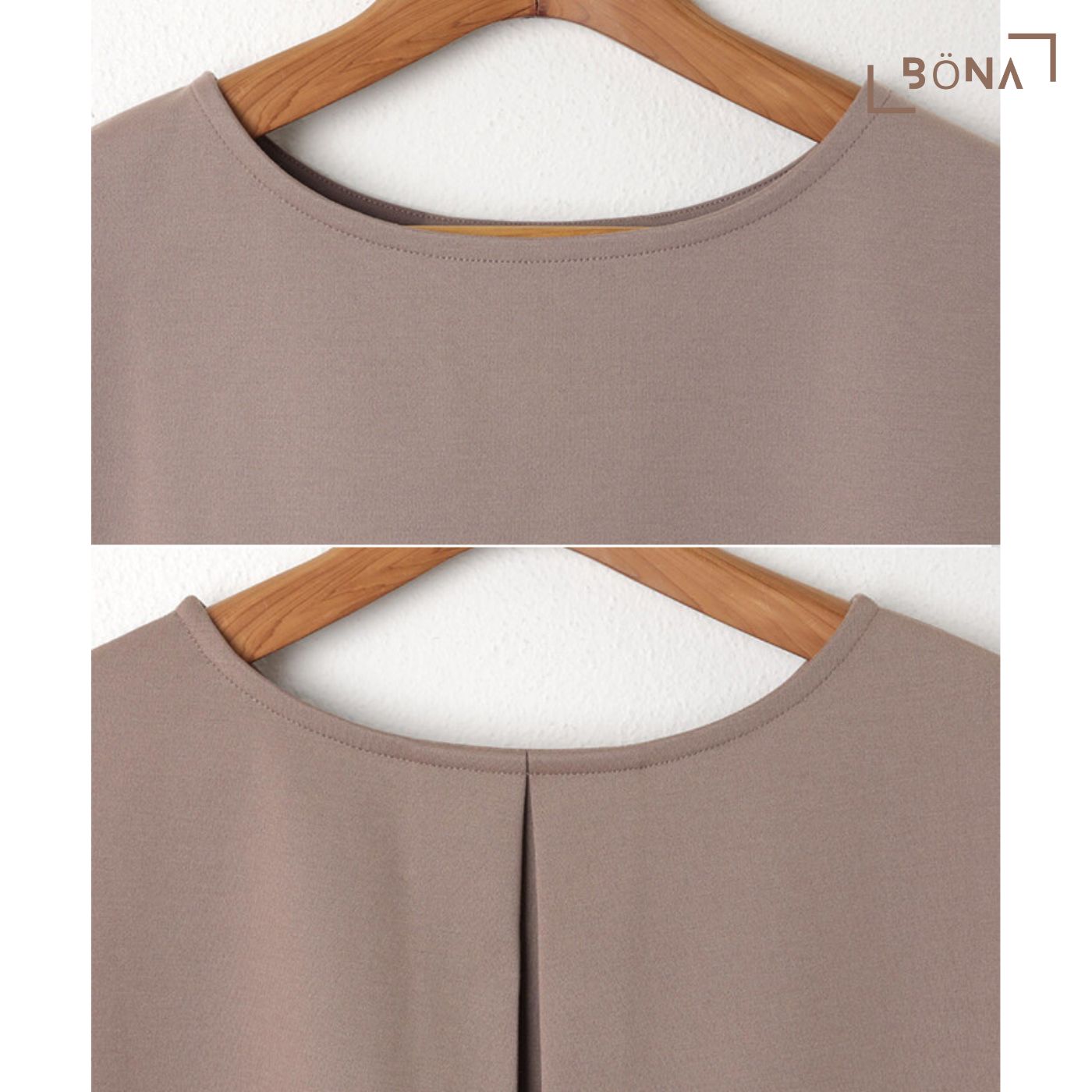 適度遮蓋上臂的法式袖。寬鬆的圓領和縮回後背為背部增添一絲細微差別。